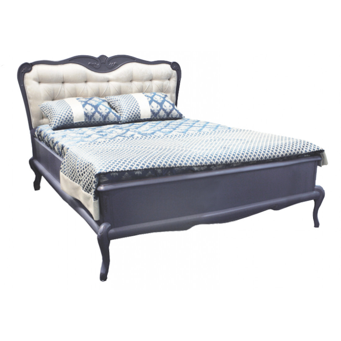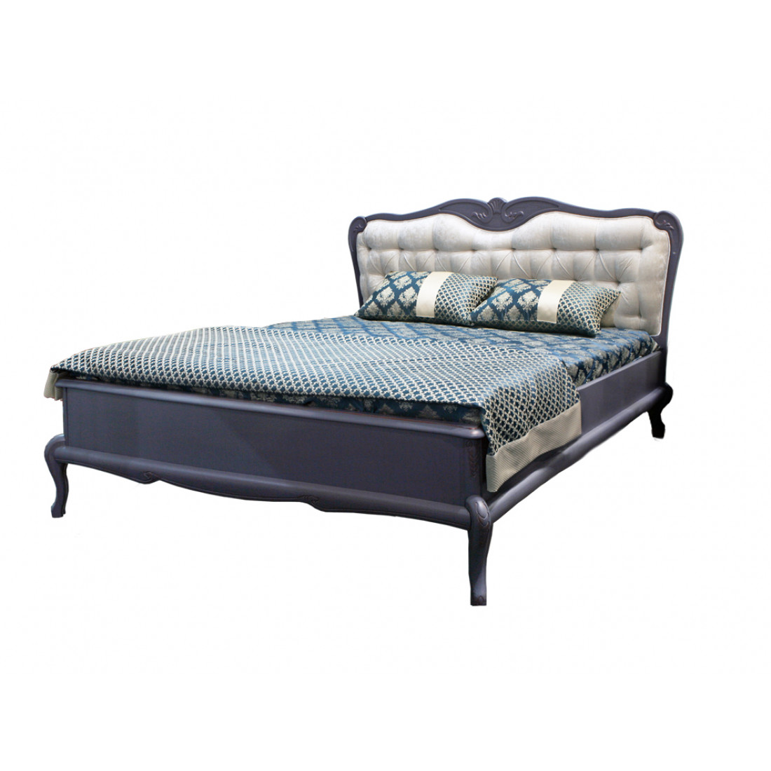 Вертикальные бруски, опоры и бруски, соединяющие их, карниз, рама спинки головной кровати из массива дуба, с художественной резьбой. Кровать с мягким элементом, обрамлённым фигурной рамкой. Двери шкафа представляют из себя раму из массива бука с филёнкой из плиты ДСП облицованной шпоном вишни. Крышка комода и тумбы прикроватной из плиты МДФ облицованной шпоном бука. В ящиках накладки гнутые, из плиты МДФ облицованной шпоном вишни, короб из плиты ламинированной, на дно ложится вкладыш облицованный тканью.