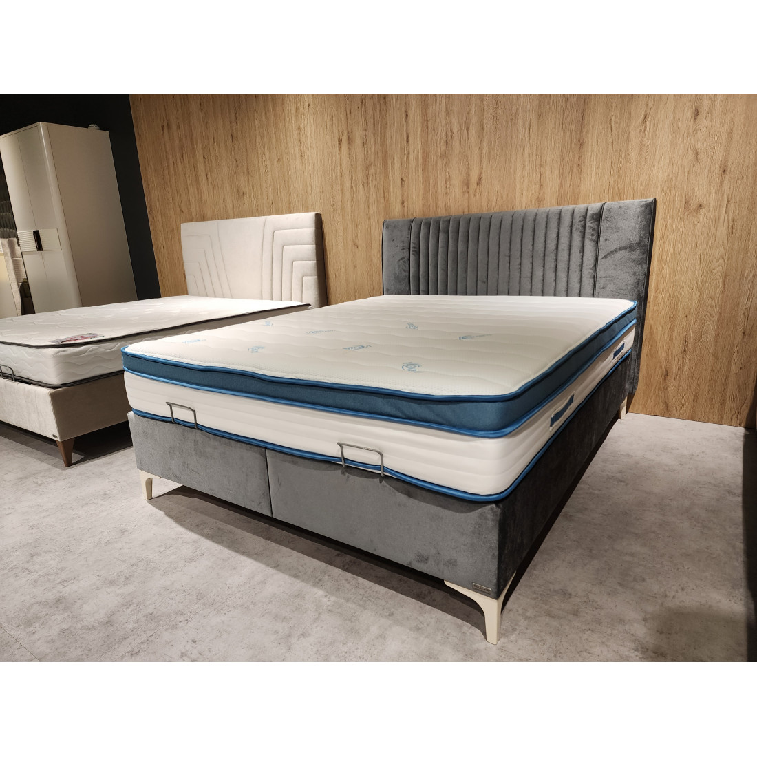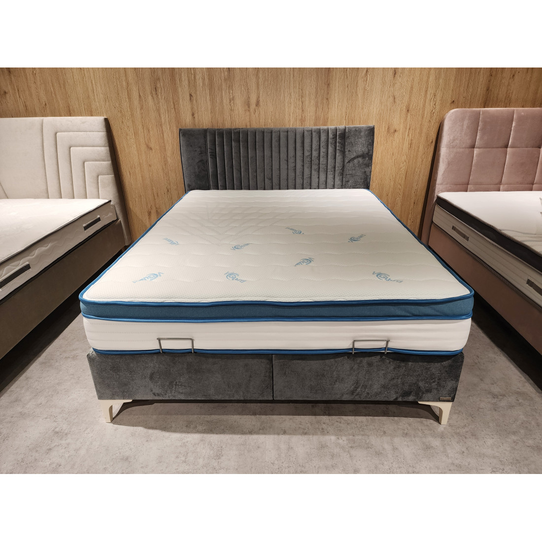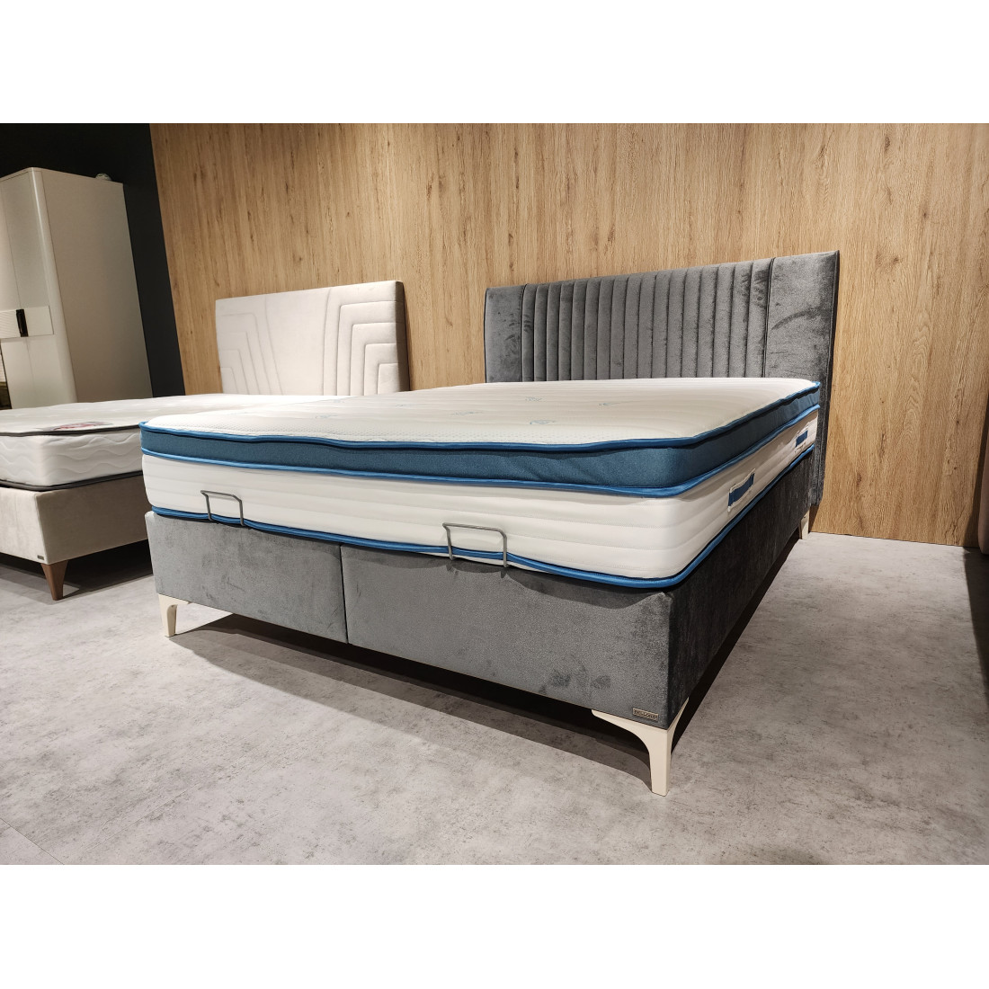 Кровать (база) SONATA, щитовой конструкции на декоративных ножках c подъемным жестким основанием под матрас, с изголовьем. Щитовой каркас кровати плита ЛДСП т.18мм, дно плита МДФ 6мм. Каркас обит поролоном т.6мм, тканью мебельной. Жесткое основание кровати рамочной металлической конструкции на основе трубы профильной размером 20х30,20х20 с подъемным механизмом. Настил основания поролон т.3мм, основание обито тканью. Сборка каркаса базы на шкант пластмассовый, скобу металлическую, уголок пластмассовый. Подъемный механизм устанавливается при помощи винтов и винтов с гайками. На дно базы устанавливается аэратор пластмассовый с логотипом Bellona для кондиционирования воздуха. Ножки кровати пластмассовые, четыре ножки декоративные, четыре опорные круглые ввинчивающиеся для двойных баз. Ручка -держатель для подъемного основания металлическая.