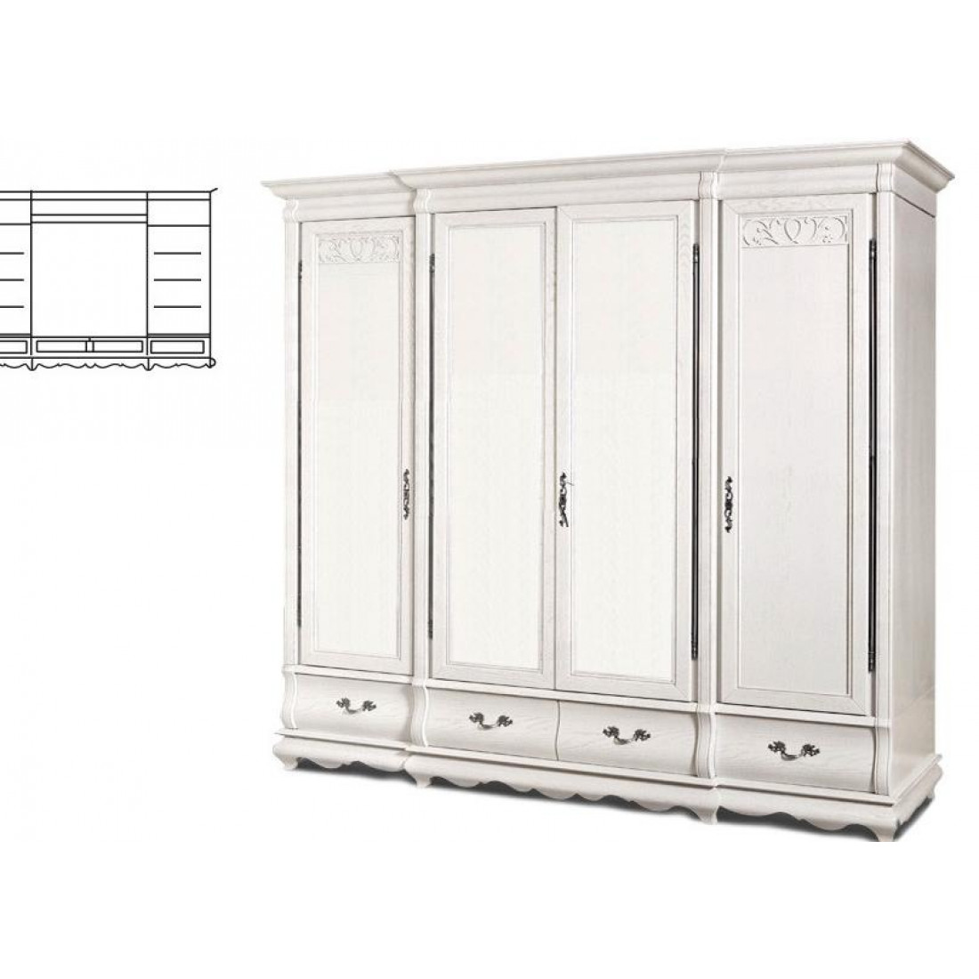 Массивный четырехдверный шкаф для спальни из коллекции "Оскар" органично впишется в интерьер в классическом стиле. Центральные двери имеют встроенные зеркала. Высокие карнизы и романтичный резной узор придают модели изящества. Выдвижные бельевые ящики на направляющих. Фасад выполнен из массива дуба, модель окрашена в оттенок "Белая эмаль с патиной".